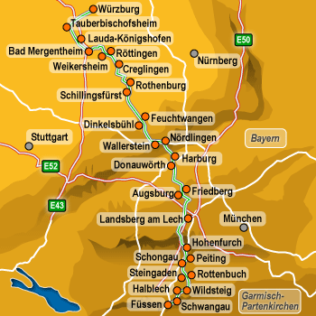 A Rota Romântica começa no Sul, em Füssen e termina no Norte em Würzburg.